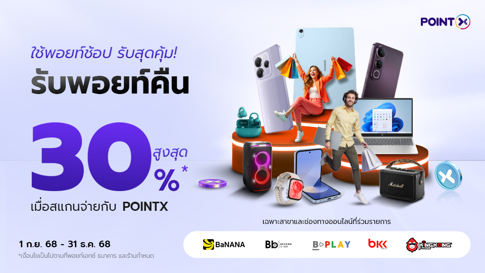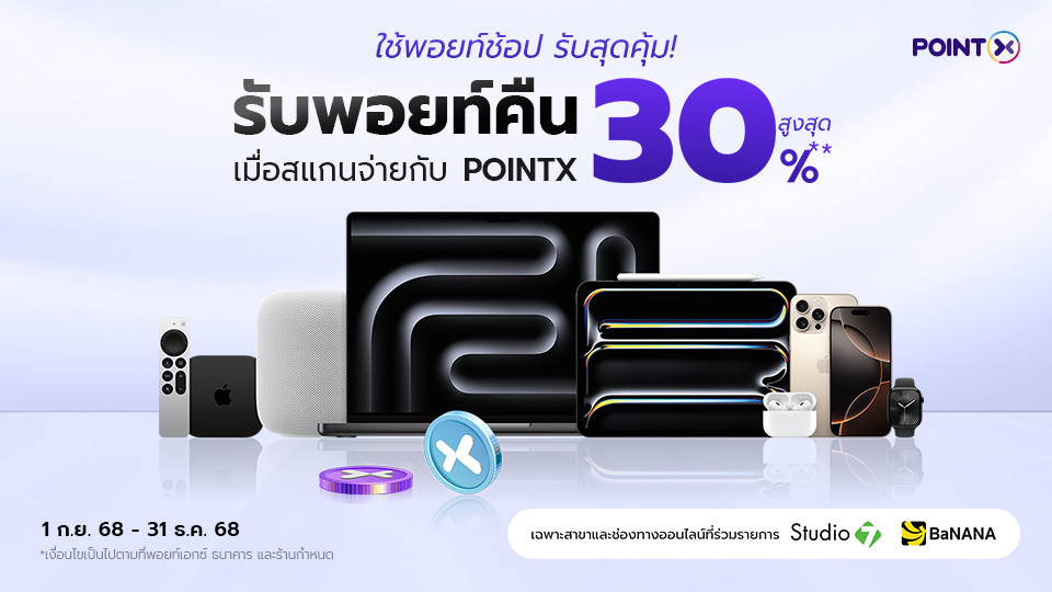 สิทธิพิเศษ! ลูกค้าบัตรเครดิต CardX รับคะแนน POINTX 1,150 คะแนน เมื่อมี CardX App และสมัคร POINTX ครั้งแรก ผ่าน SCB EASY App ตั้งแต่ 24 ตุลาคม 2568 – 31 ธันวาคม 2568
