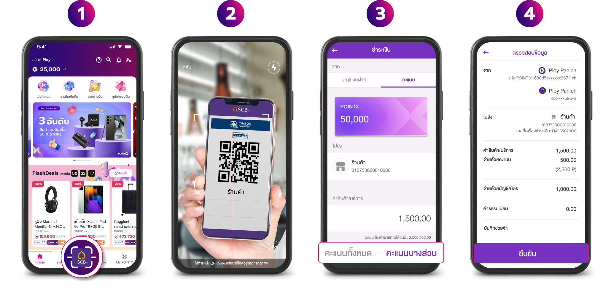 1. กดปุ่มสแกนจ่ายสีม่วงบน POINTX หรือเลือกเมนูสแกนจ่ายบนแอป SCB EASY