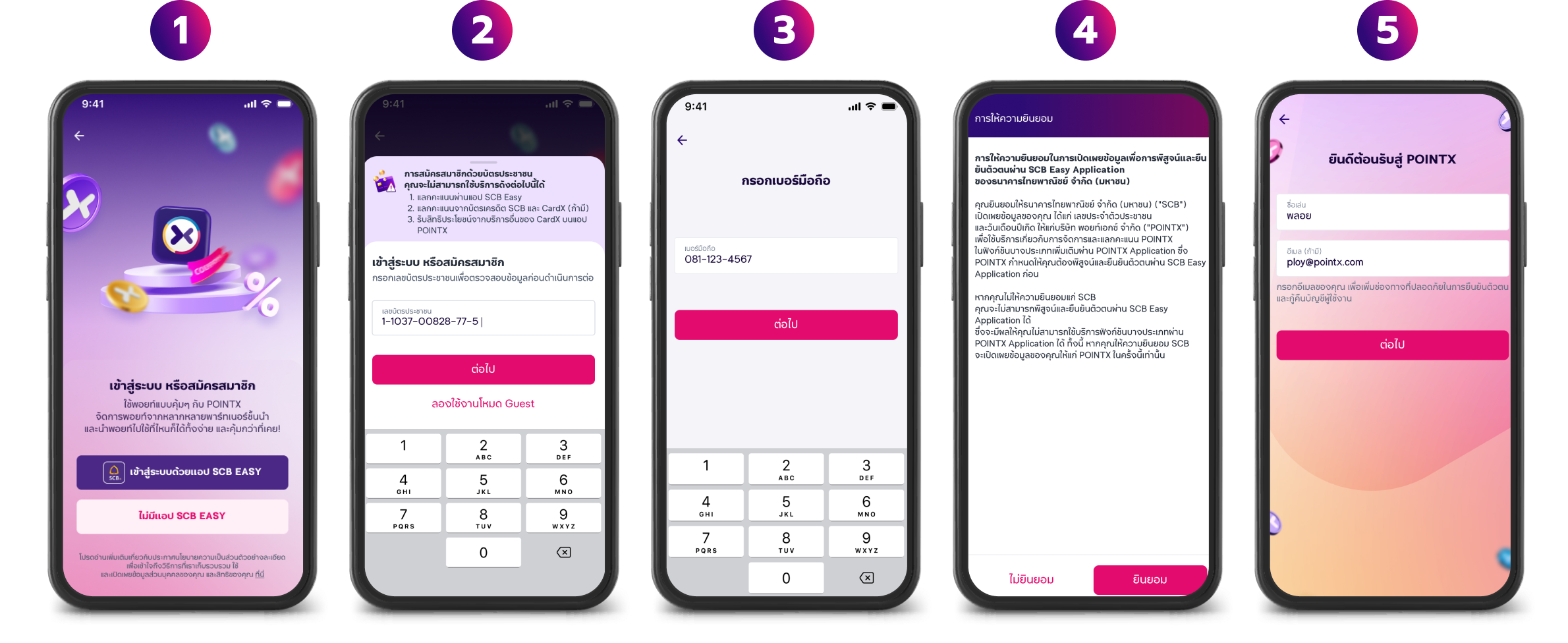 *การยืนยันตัวตนผ่านแอป​ SCB EASY จะทำให้ลูกค้าสามารถแลกคะแนน POINTX ผ่านบริการบนแอป SCB EASY ได้ สามารถใช้คะแนน POINTX ที่ได้รับจากบัตรเครดิต SCB/CardX ได้ และยังได้รับสิทธิประโยชน์จากการใช้บริการของ CardX ได้อีกด้วย